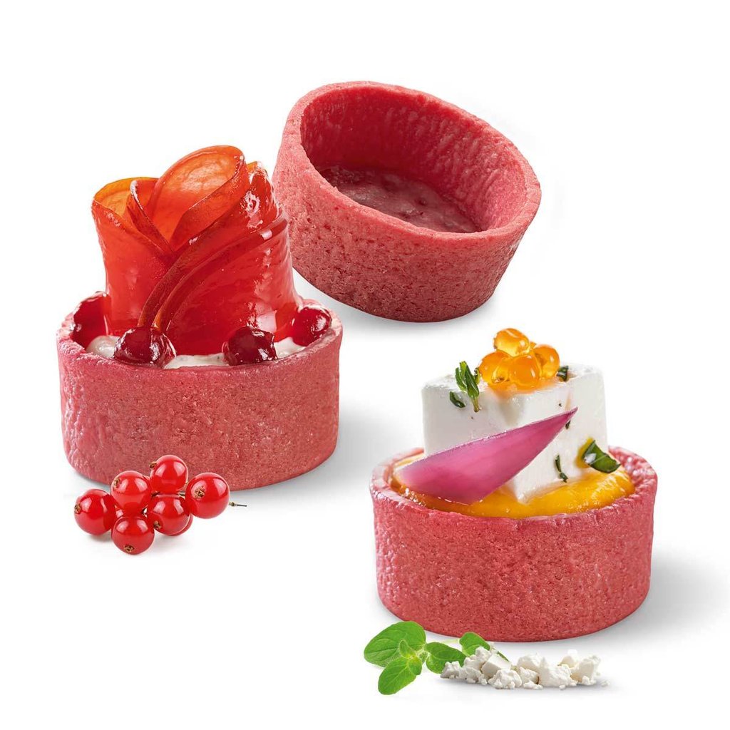 Grazie alla pasta neutra, queste mini-tartellette rosse possono essere riempite sia dolci che salate. Uno strato aggiuntivo neutro a base di olio vegetale mantiene inoltre le tartellette formate e croccanti anche dopo il riempimento.