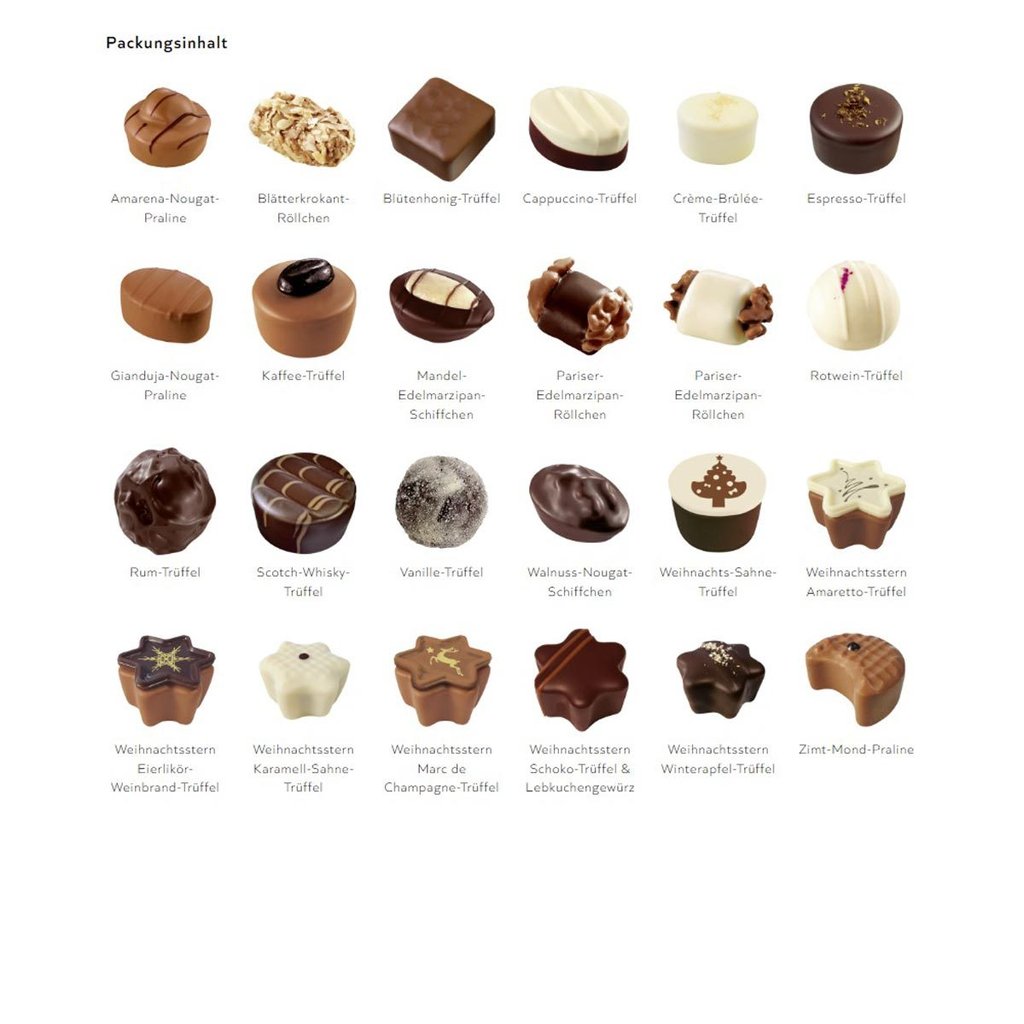 zucchero, burro di cacao, impasto di cacao, LATTE INTERO IN POLVERE, PANNA, NOCCIOLE, MANDORLE, NOCI, polvere DI LATTE MAGRO, sciroppo di glucosio, BURRO, acqua, cognac, GRASSO DI BURRO, umidificante sorbitolo, Ciliegie selvatiche, miele, LIQUORE ALL'UOVO, LIQUORE DI MANDORLE, sciroppo di zucchero invertito, EMULSIONANTE LECITINA DI SOIA, emulsionante lecitina disemi, emulsionante fosfati di ammonio, vino rosso, whisky, rum giamaicano, succo di mela, di, succo di mela concentrato, Marc de Champagne, Liquore d'uva, vodka, Grappa alle prugne, Espresso in chicchi, (frantumato al pestello) , Caffè torrefatto, estratto di vaniglia, aroma naturale, cannella, (macinate), concentrato di mela, acidificante acido citrico, spezie, PANNA IN polvere, bourbon vaniglia, colorazione degli alimenti(succo di barbabietola rossa), Succo di ciliegia selvatica(concentrarsi), colorante antociani, coloranti curcumina, colorante carbonato di calcio, colorante capsanthin, agente ricoprente gomma arabica, agente ricoprente gommalacca, pimento, mazza, garofano, anice, estratto di vaniglia bourbon, cardamomo, polvere di cacao, alcol etilico, maltodestrina, Ribes nero in polvere, amido modificato, carota concentrato Può contenere tracce di: altri FRUTTI IN GUSCIO |